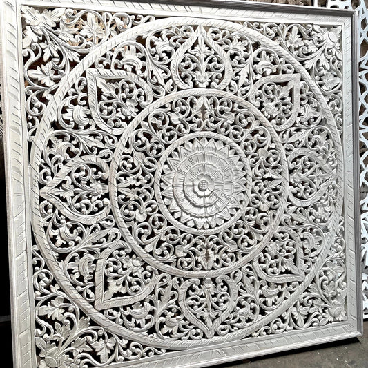 Hand Carved Queen Size Mandala Bed Headboard - 'Umadewi' in White Wash