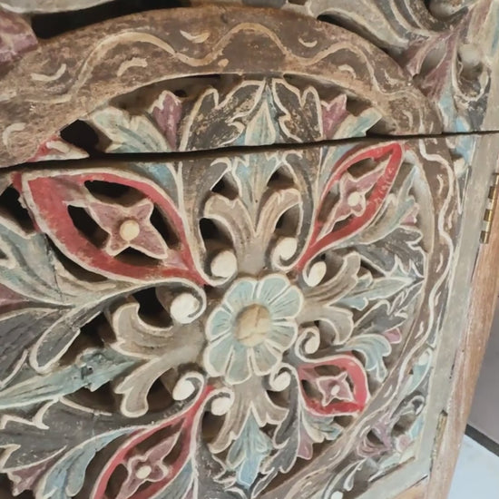 Wooden Carved Bedside Table 'Sekar' - Natural and Multicolor Blue - 60 cm