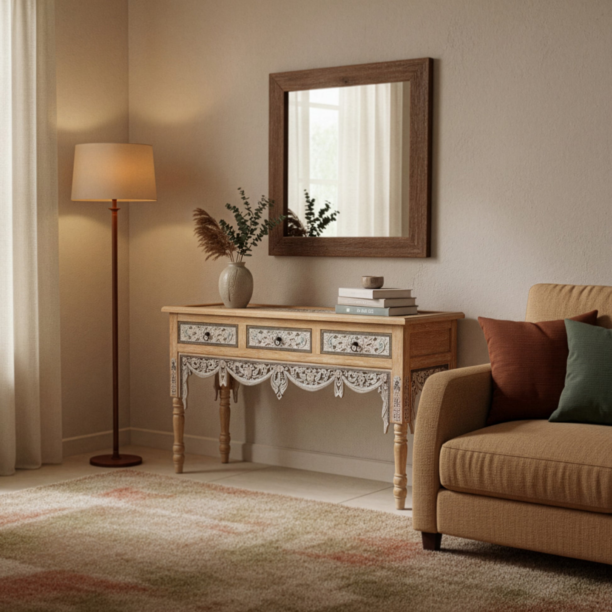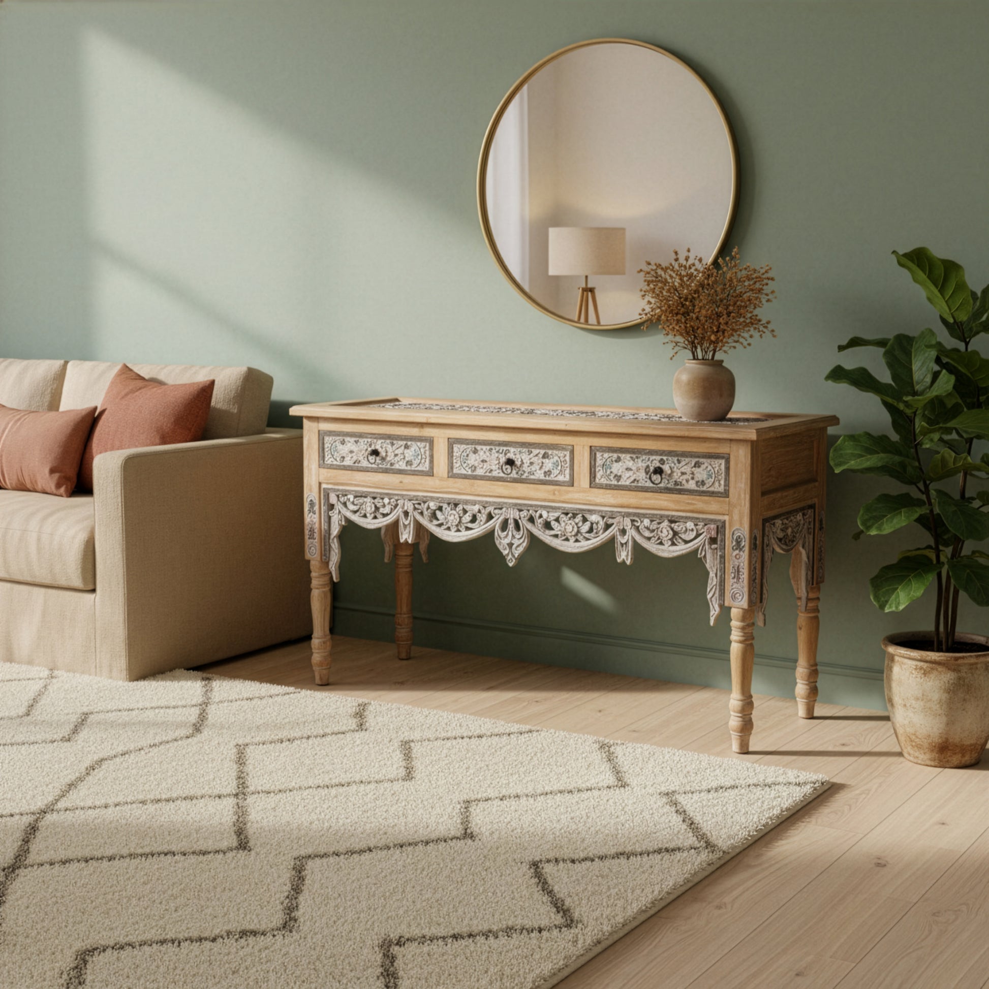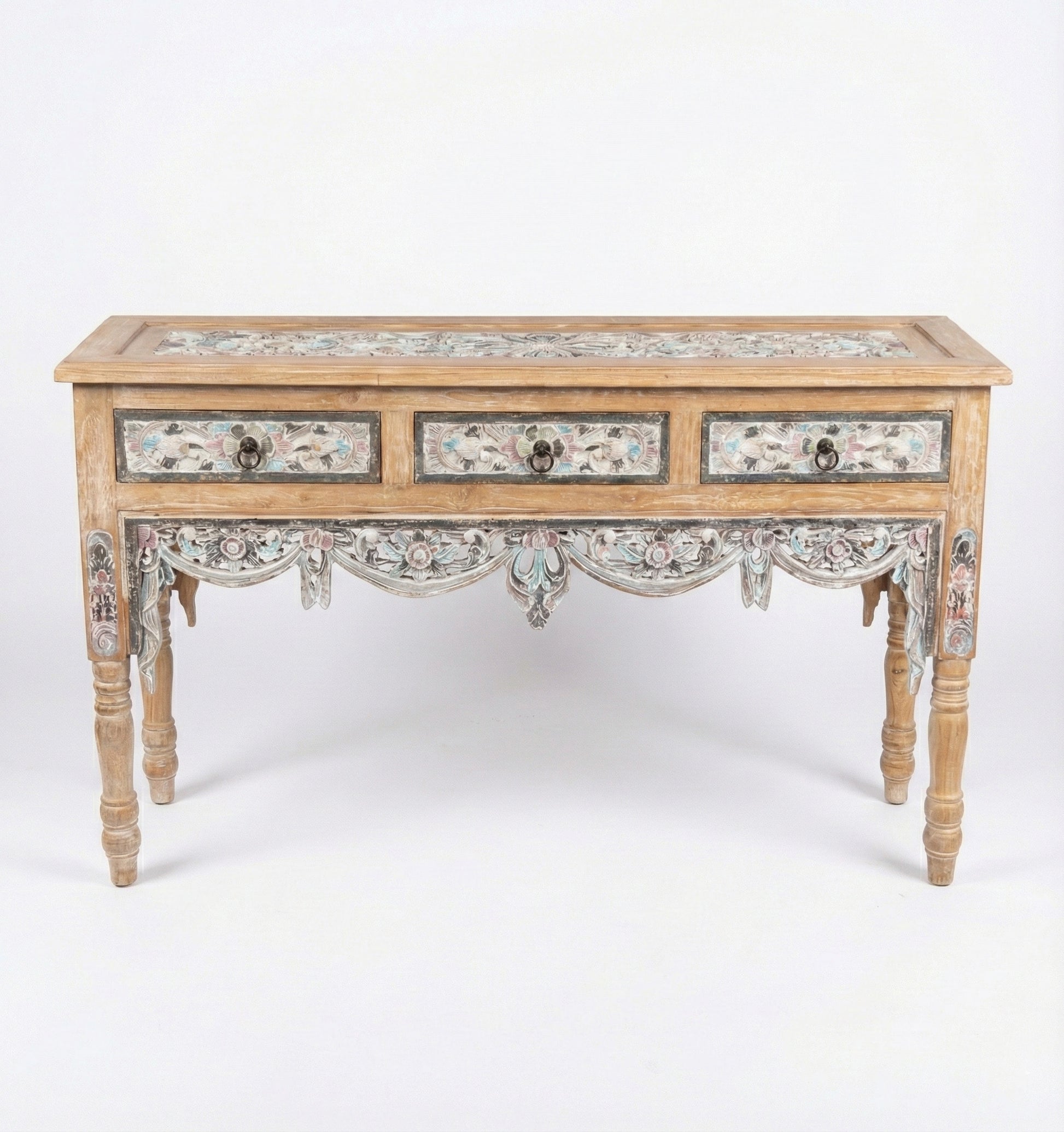 The detailed carved apron and drawer panels showcase artisan workmanship, while the natural wood finish brings depth and texture. Three functional drawers provide practical storage for keys, mail, or everyday essentials, making it perfect for entryways, hallways, or living spaces.