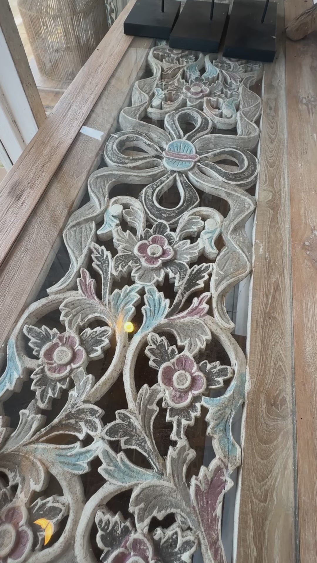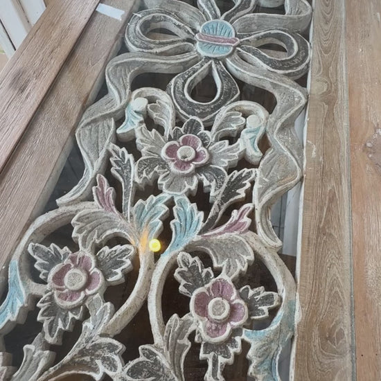 Add warmth, artistry, and character to your home with this beautifully handcrafted carved console table. Featuring intricate hand-painted floral detailing in soft white and blue tones, this piece blends traditional craftsmanship with rustic elegance.